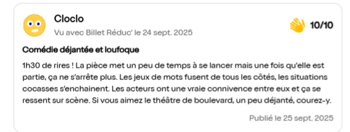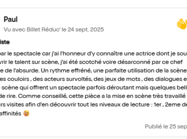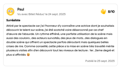 Une expérience théâtrale unique qui m'a fait réfléchir et rire.